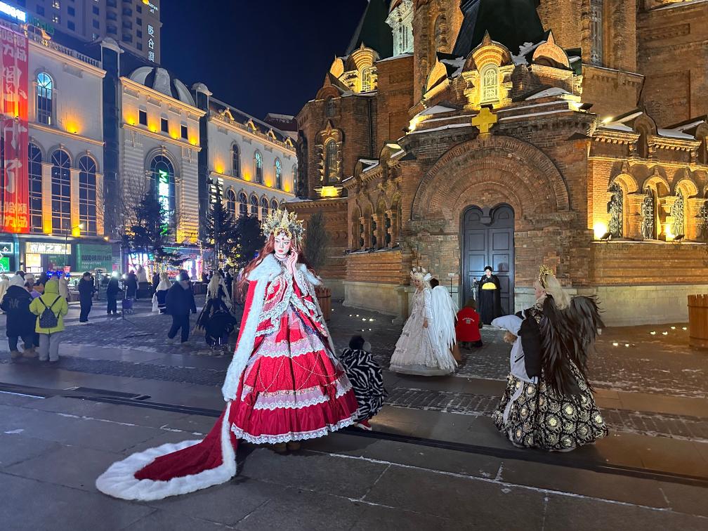 “三步一公主,五步一女王”。红色丝绒披风、黑色羽毛翅膀、白金相间的礼服……夜晚的索菲亚广场俨然成为魔法秀场,在专业灯光设备下,摄影师们卖力指挥,游客们或嫣然一笑,或神情严肃,在冰城留下独有的美丽回忆。