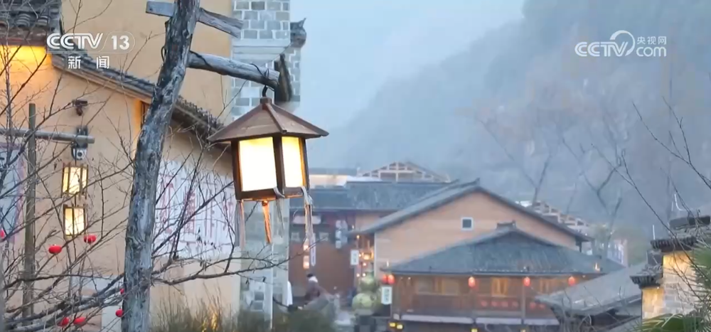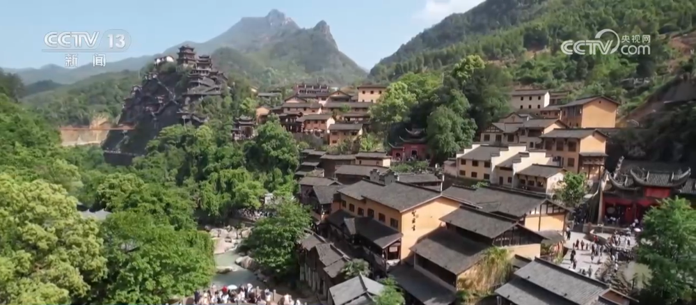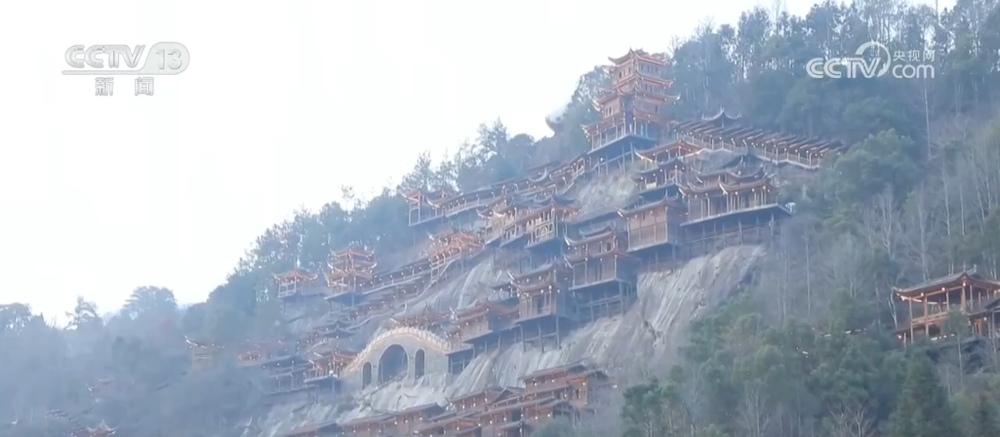 初春的望仙谷景区山峦笼雾,青砖褐瓦的仿古建筑伫立在崖壁上,青石板路上游人如织,不少身着汉服的游客穿梭其中,与古雅的景致相映成趣。