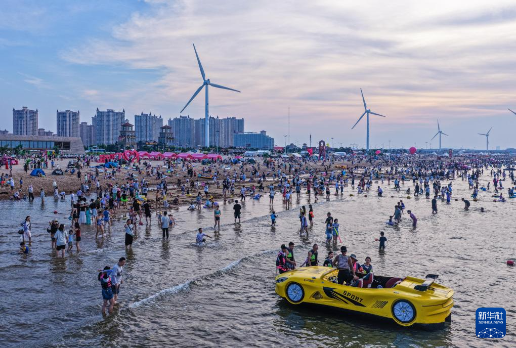 8月23日,游客在位于山东省荣成市的那香海海水浴场体验水上项目(无人机照片)。