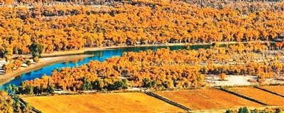 金秋时节,库车市塔里木胡杨林绚烂如画,金黄的胡杨林倒映在静谧的水面上,构成一幅迷人的秋日画卷。
