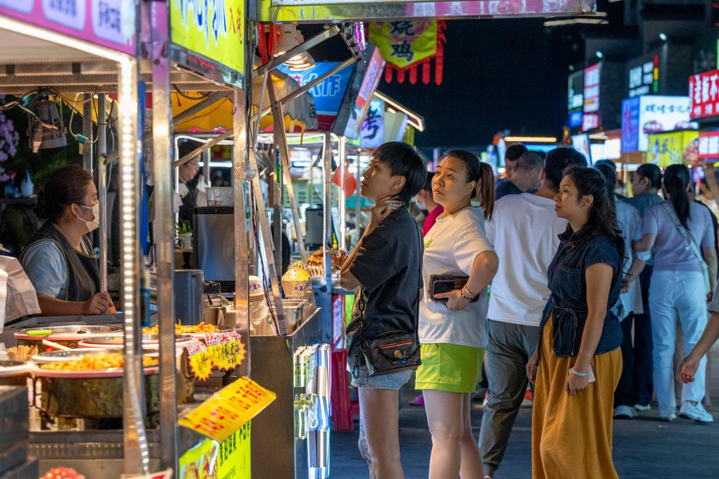 2025年10月19日,市民和游客在广西梧州市长洲区红岭街道水云天夜市品尝当地美食。CICPHOTO/何华文摄