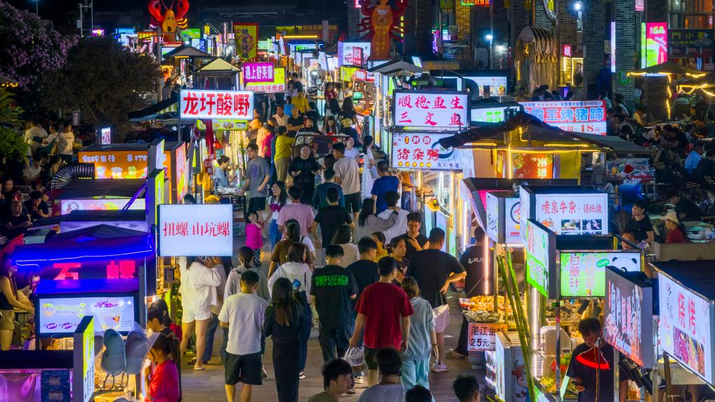 2025年10月19日,市民和游客在广西梧州市长洲区红岭街道水云天夜市品尝当地美食。(无人机照片)CICPHOTO/何华文摄