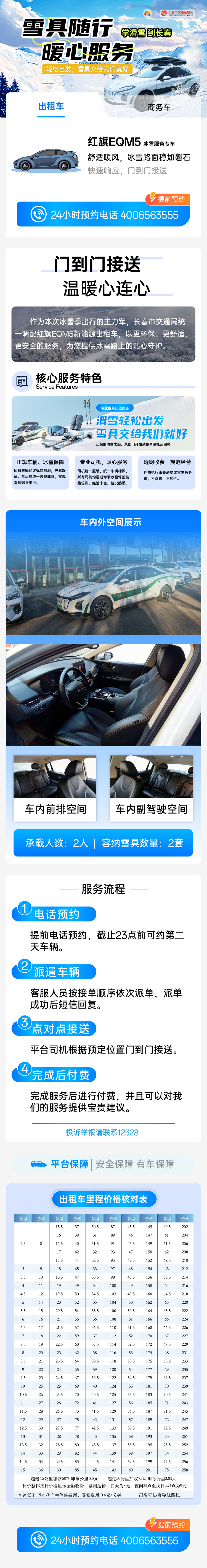 为保障服务质量,该专属运输服务以“四个统一”构建标准化服务体系。统一装备,巡游车在车顶统一加装雪具固定装置,确保雪具运输安全无忧;统一平台,调度平台与所有服务车辆进行绑定,车型、时间、地点及运价信息全面公开透明;统一派单,调度中心客服人员全天在线,保障乘客下单后迅速响应、及时派车上门,实现雪具运输与行程规划的精准同步;统一服务,由企业精选优质驾驶员,以文明贴心的服务细节,温暖每一段冰雪旅程。