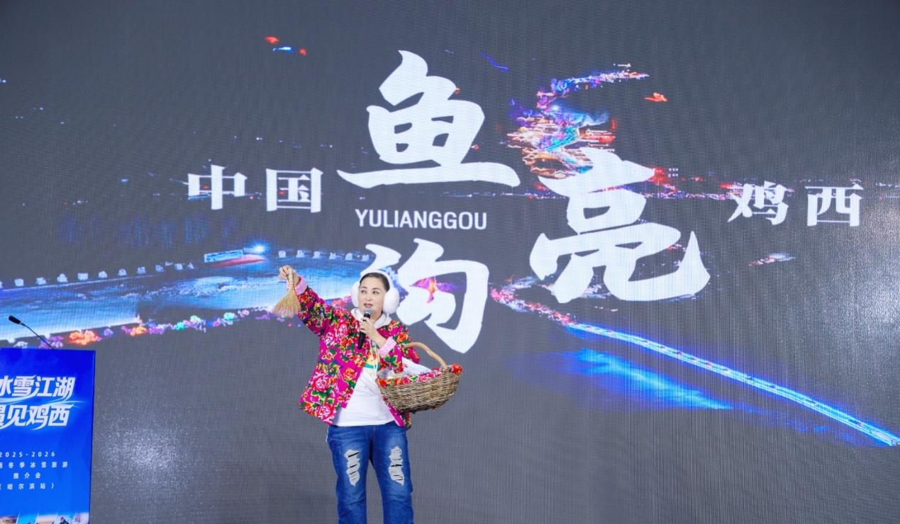 随后,虎林星推官带来“全国红色研学旅行优选目的地城市”的冬日惊喜,通过推介与舞蹈相结合的形式,展现虎头要塞的历史回响与珍宝岛的界江雪韵;密山星推官则带领大家领略“东方第一湖”兴凯湖的千里冰封与城市温情;鱼亮沟景区星推官解锁东北民俗与冰雪景致相融的山野闲趣,热炕头、扭秧歌、地道东北菜等元素勾勒出别样的冬日体验。鸡西旅行社行业代表也登台发出合作邀约,彰显了鸡西文旅携手共赢的广阔愿景。