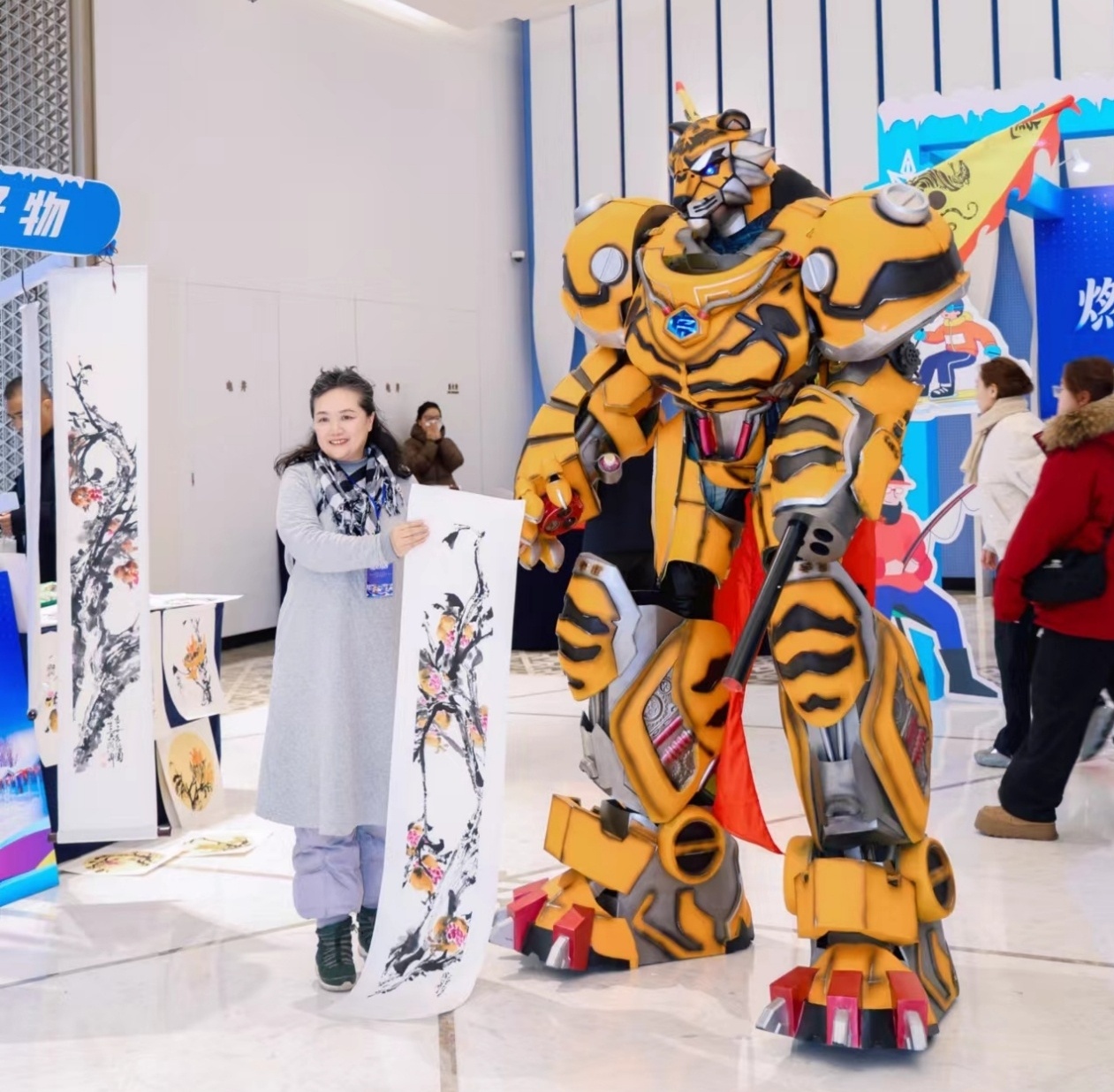 场内推介气氛热烈,场外展示同样热闹非凡。鸡西市各区县展位各具巧思,构建起集“特色展示+互动体验+打卡传播”于一体的多功能文旅空间,更有威风凛凛的老虎机甲和“吉米虎”玩偶与嘉宾互动,还有特色美食品尝,与会嘉宾在看、听、尝中沉浸式感受鸡西魅力。