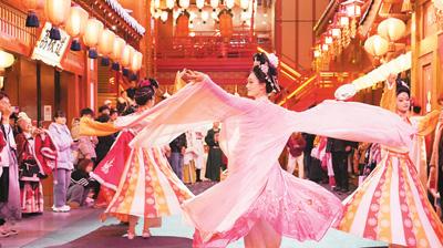 演员在陕西西安的长安十二时辰主题街区进行沉浸式表演。