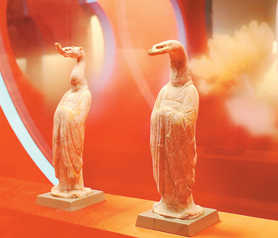 唐代彩绘生肖龙陶俑(左)、蛇陶俑。杜建坡摄
