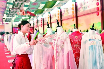 在山东曹县大集镇一家汉服基地,主播直播推介汉服。新华社记者郭绪雷摄