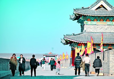 游人在宁夏盐池县的城墙上散步赏景。新华社发