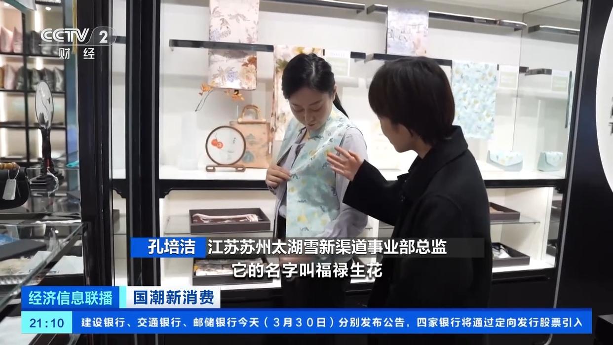 江苏苏州太湖雪新渠道事业部总监孔培洁:它的元素有中国传统的葫芦、蝙蝠还有花,名字叫福禄生花,寓意福禄双全,一路生花。这是跟我们马甲同款的披肩、包,我们还有很多宋锦礼盒。整个宋锦细分的销量增长了100%。