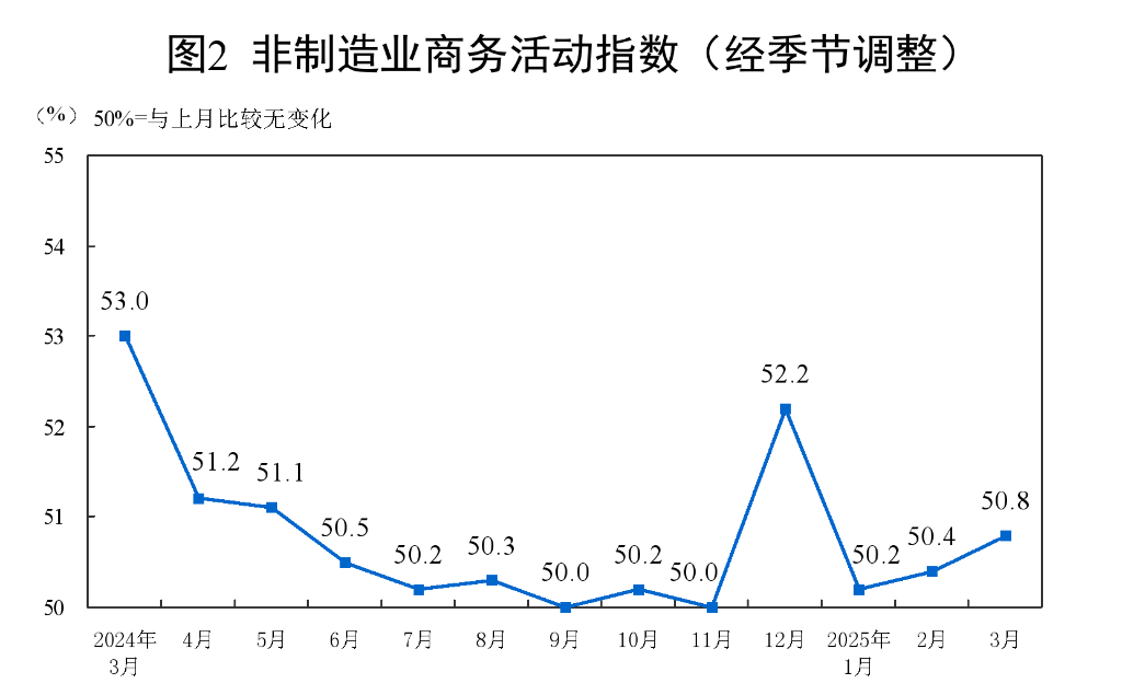 3月份,非制造业商务活动指数为50.8%,比上月上升0.4个百分点,非制造业扩张步伐有所加快。