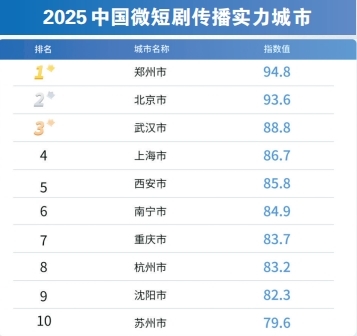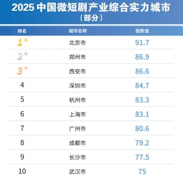 郑州以86.9的综合得分,位列微短剧产业综合实力城市第二名