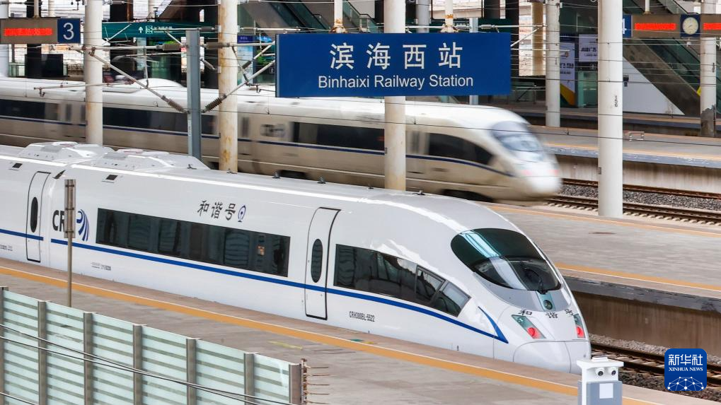 1月25日,在天津市滨海新区,动车组列车准备驶出天津滨海西站。