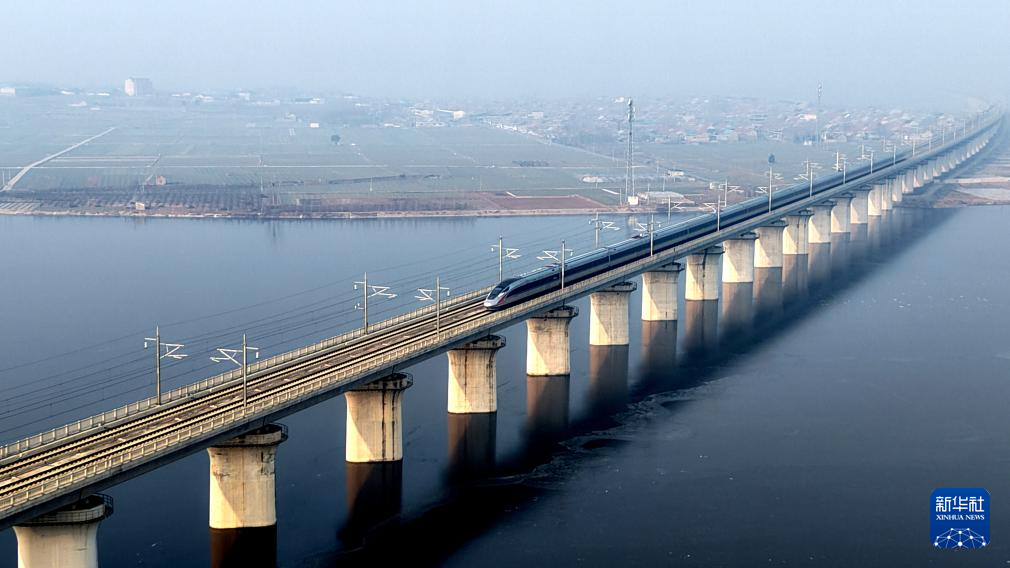 1月25日,动车组列车行驶在山东省临沂市平邑县境内(无人机照片)。