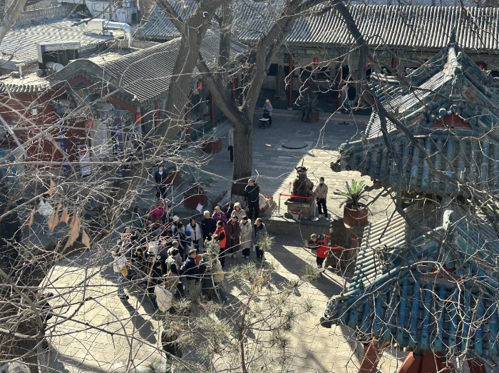 在纯阳宫的回廊和殿宇间,随处可见驻足观赏的游客。最具特色的要属导游讲解区域——游客们里三层外三层地围在导游身边,有的伸长脖子望向所指的文物,有的举起手机记录讲解内容,还有的频频点头。一位带着孩子的家长表示:“趁春节带孩子来纯阳宫,就是想让他在热闹的节日氛围里,也能感受到咱们传统文化的魅力。听导游一讲,这些古建筑和文物都‘活’起来了。”