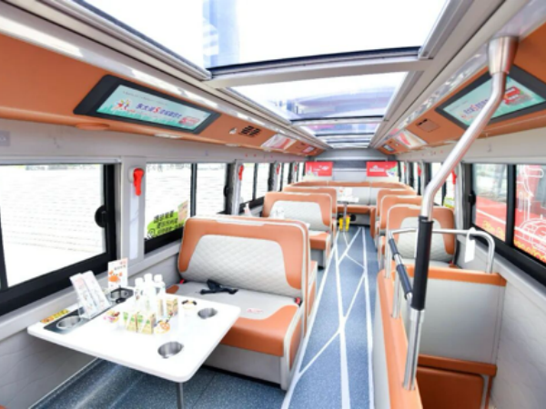 此次投用的双层观光巴士拥有180度全景视野,游客可全方位饱览东太湖的湖光岸景。车厢内还特别引入太湖雪、金猫咖啡等吴江本土特色品牌,让游客在欣赏美景的同时,品尝地道的吴江味道,带走专属的太湖记忆。