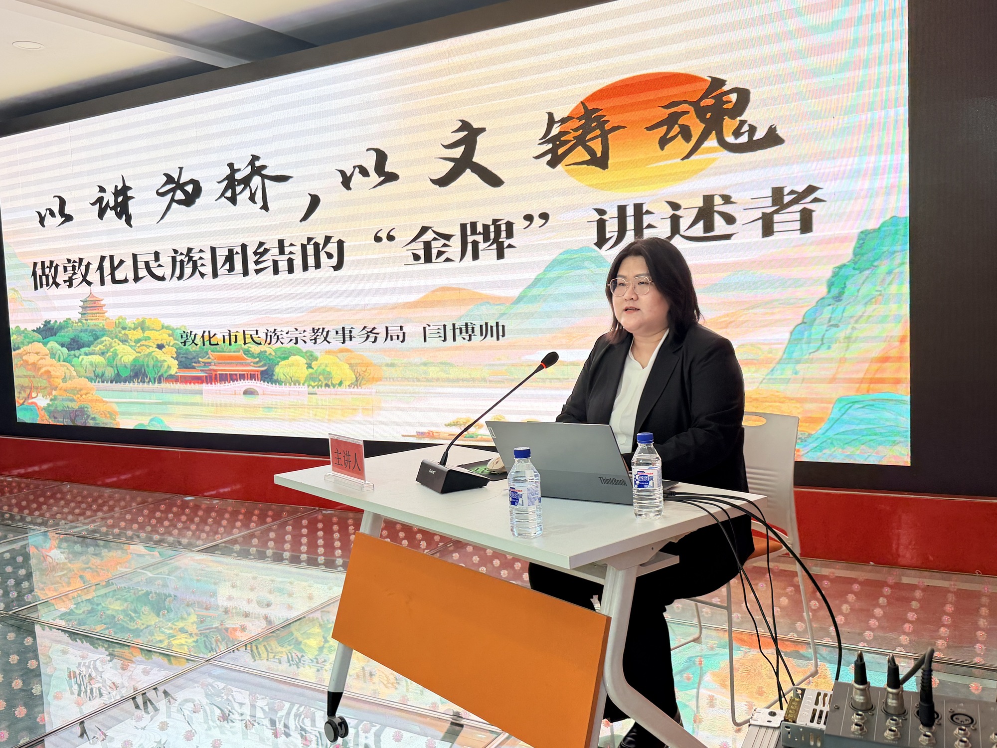 敦化市民宗局闫博帅以《以讲为桥,以文铸魂——做敦化民族团结的“金牌”讲述者》为题开展授课,围绕铸牢中华民族共同体意识核心要求,结合敦化各民族交往交流交融的历史渊源与现实实践,将敦化民族团结故事、红色历史、民俗文化、人文底蕴融入讲解内容,打造有温度、有深度的讲解作品,成为传递民族温情、凝聚民族共识的“金牌讲述者”。