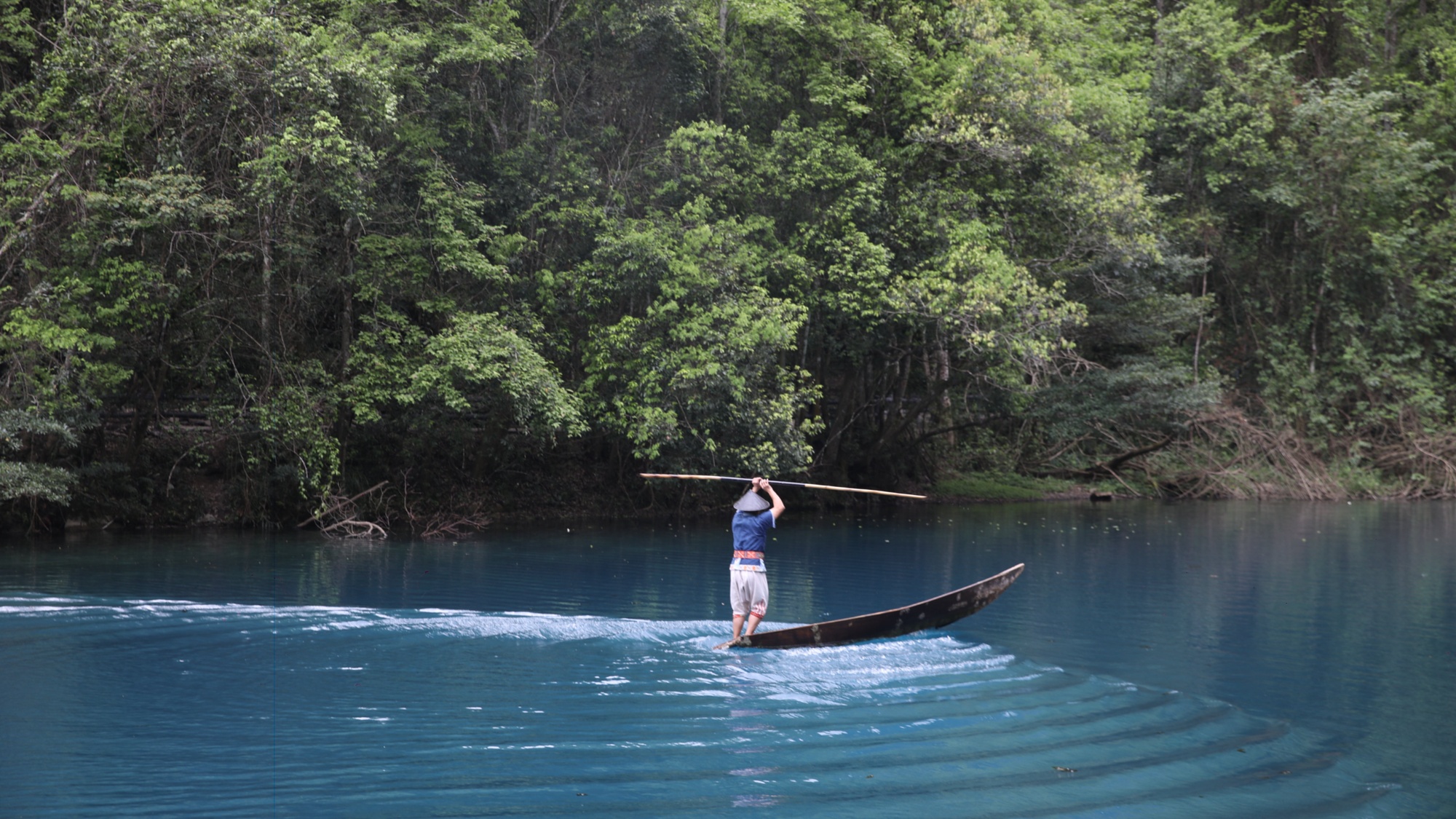 游客在上己定湖乘坐游船(荔波县融媒体中心供图)