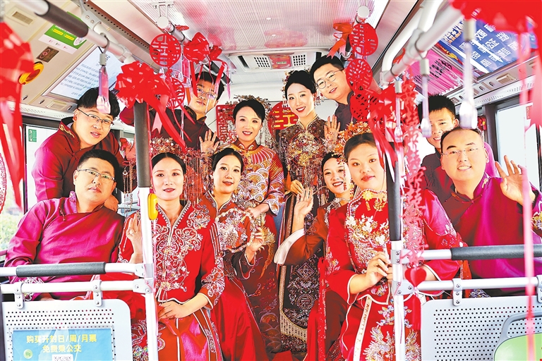 在开封市禹王台区,参加集体婚礼的新人在公交婚车上合影留念。 受访者供图