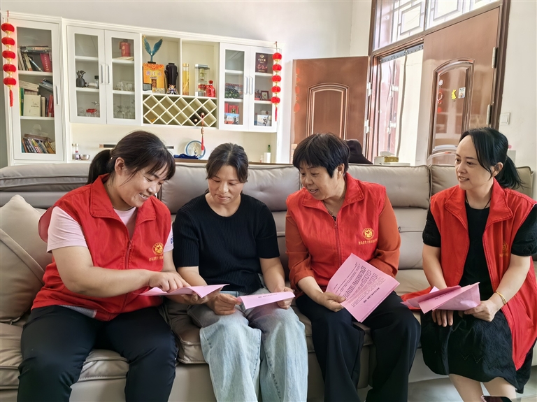 在西平县盆尧镇陈老庄村,陈春荣(右二)带领公益红娘到村民家中宣传移风易俗。受访者供图