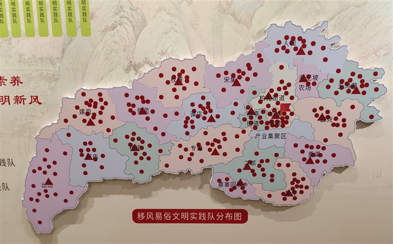 当天,在西平县移风易俗主题展厅,记者看到一张布满红点的“地图”。“这是西平县的移风易俗文明实践队分布图。”刘收介绍,目前该县每个村(社区)基本都设有实践队,约300支队伍宣传辐射文明新风,并协助建设主题公园、移风易俗展馆和文化墙、制定村规民约等。