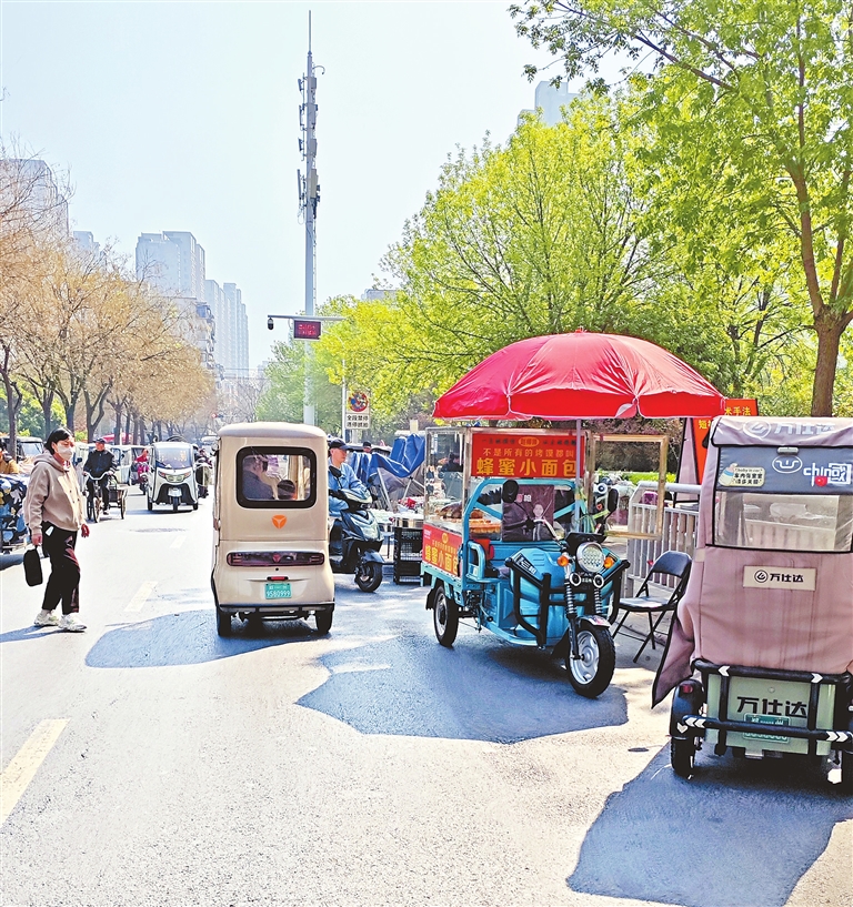 4月1日早上,记者在郑州市二七区华中路与碧云路交叉口附近走访发现,道路两侧聚集着不少流动商贩,原本仅有的双向两车道变窄,会车时很受影响。